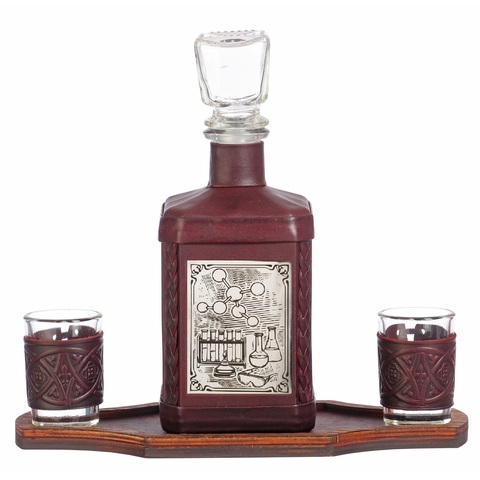 Оригинальный графин в кожаном футляре на подставке с двумя рюмками органично впишется в интерьер вашего дома или офиса, станет прекрасным подарком ценителю крепких спиртных напитков.