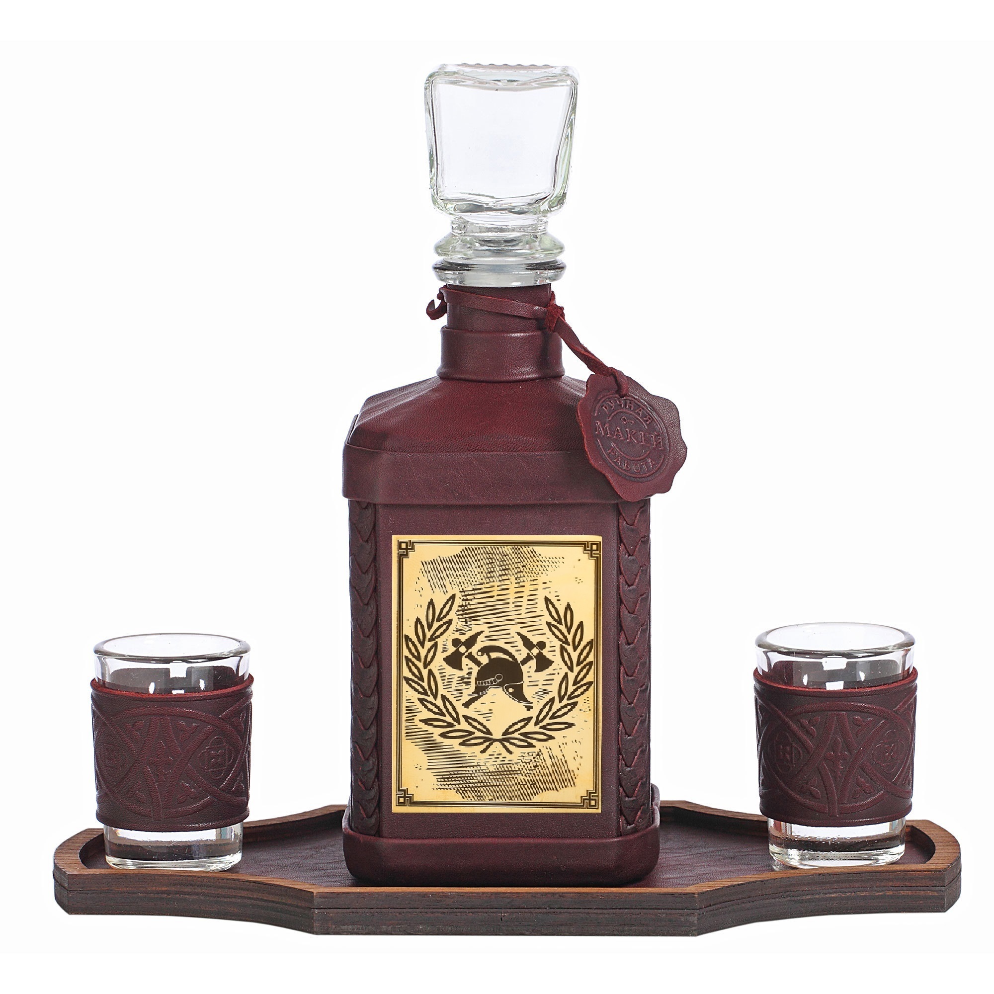 Оригинальный графин в кожаном футляре на подставке с двумя рюмками органично впишется в интерьер вашего дома или офиса, станет прекрасным подарком ценителю крепких спиртных напитков.