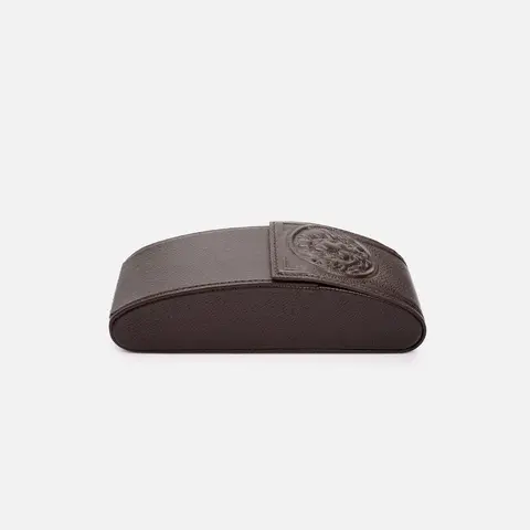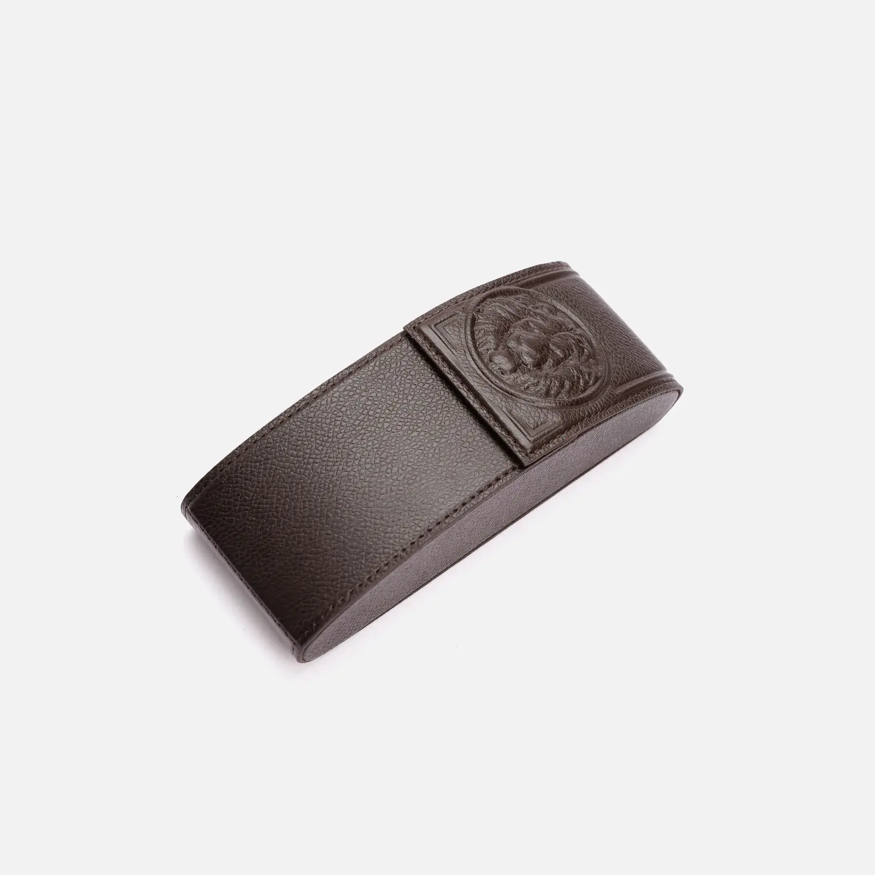 Предлагаемая модель подойдет для очков в оправе из любого материала любой формы. Благодаря уплотненному жесткому каркасу футляра, очки будут надежно сохранены от механических повреждений. Закрывается футляр на клапан с магнитной кнопкой, что предотвратит выпадение очков. Отличаясь своей долговечностью и надежностью, футляр для очков из натуральной кожи сохранит ваши очки, станет прекрасным подарком на любой случай. Данная модель с нестандартным дизайн-решением – выбор неординарной, яркой личности. Художественная вставка, эмблема в виде головы Льва, выполненная техникой декоративной гравировки по коже, выделяет такое сувенирное изделие среди других футляров для очков.