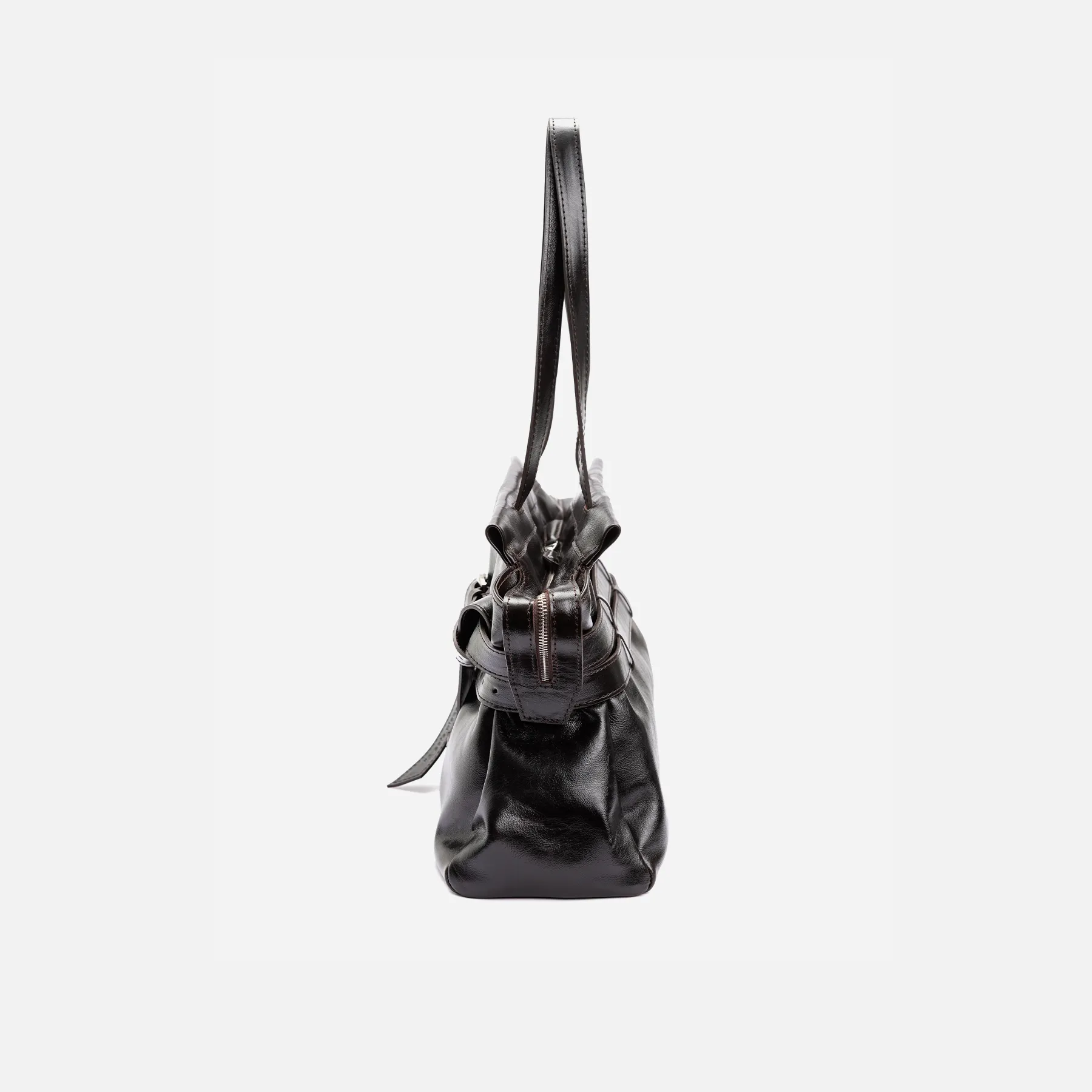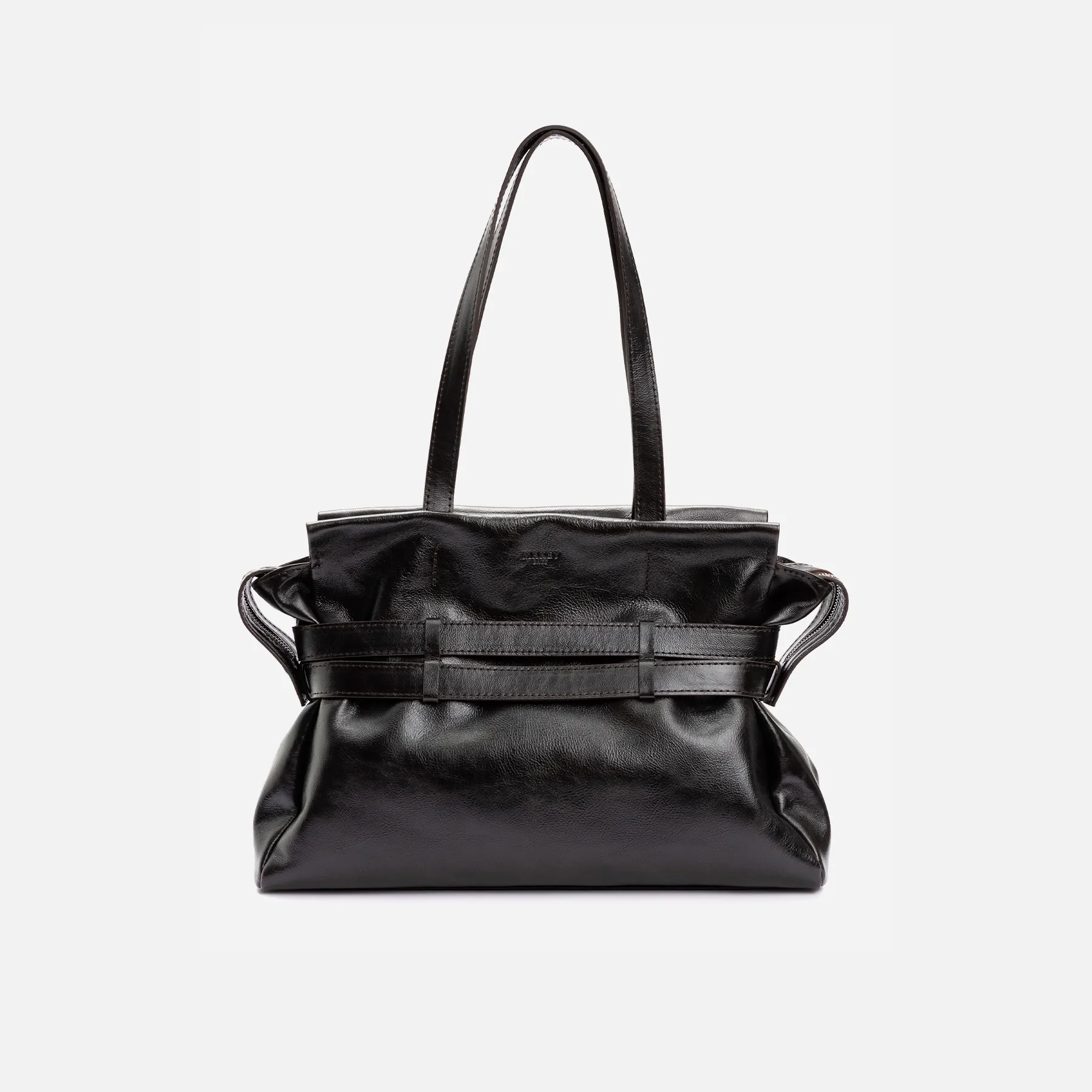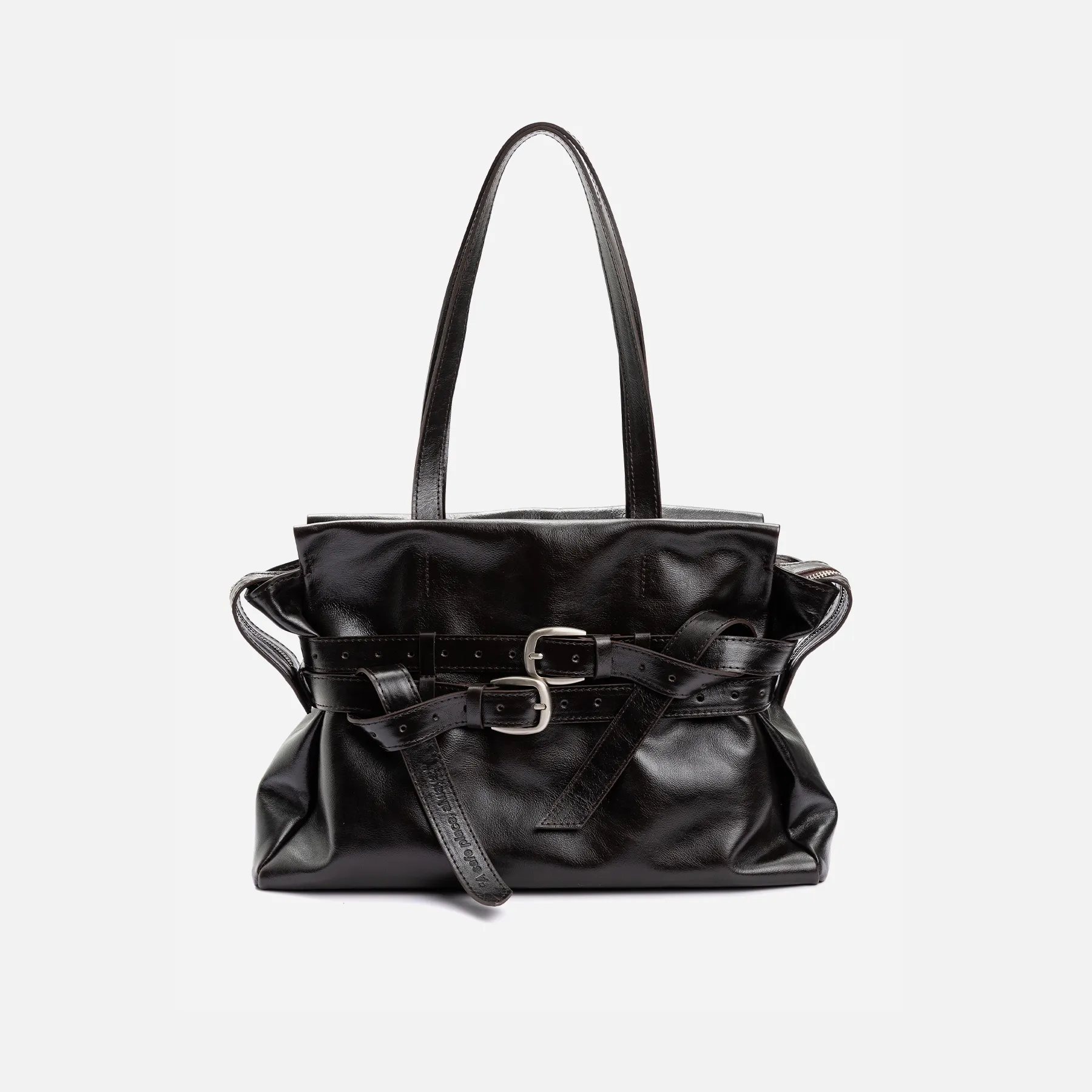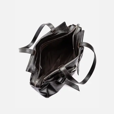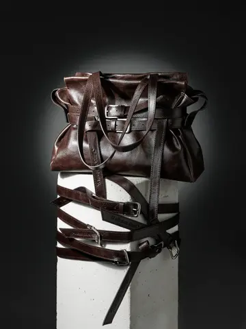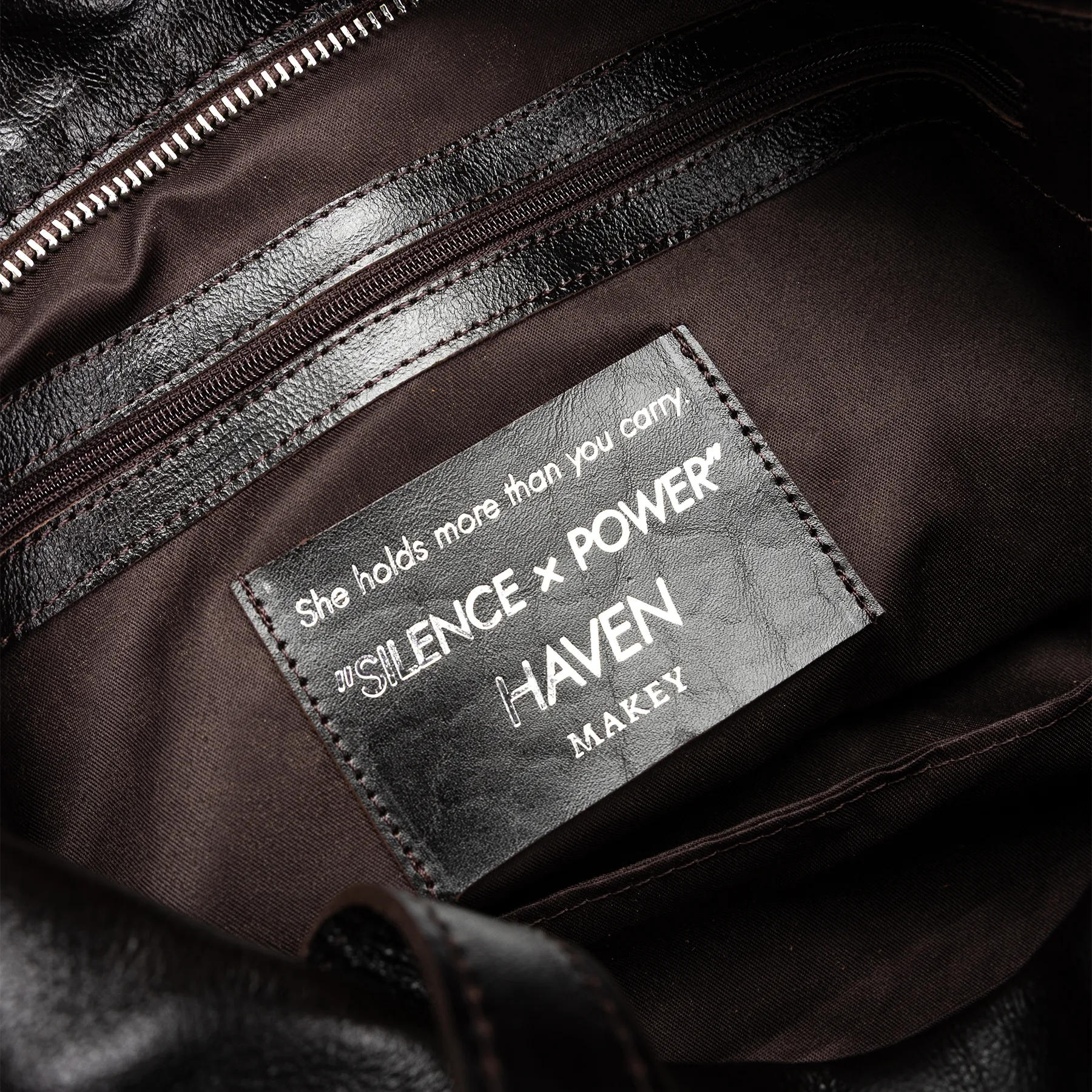 Haven — состояние опоры. Большая кожаная сумка для дня, когда важно взять с собой больше — без лишних жестов. Дизайнерский элемент — ремень, который опоясывает корпус — работает как конструктивный акцент и знак коллекции Silence x Power. Внутри — продуманная организация без перегруза: понятный доступ к основному отделению, порядок для повседневного набора. Форма держится, фактура раскрывается с ноской. Цвет — темно-коричневый: спокойный, универсальный, уместный в рабочем ритме и в особых образах. She holds more than you carry — она хранит больше, чем ты кладёшь внутрь.