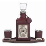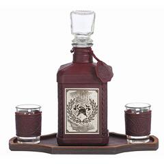 Оригинальный графин в кожаном футляре на подставке с двумя рюмками органично впишется в интерьер вашего дома или офиса, станет прекрасным подарком ценителю крепких спиртных напитков.